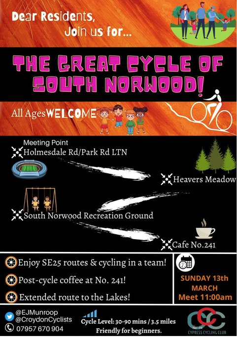 The Great Cycle will be meeting at 11am on 13th March 2022 at the junction of Park Road and Holmesdale Road, before they head off on a route round Heavers Meadow and South Norwood Recreation Ground. Please contact Elliott-Jay Munroop if you have any further questions.