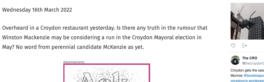 In March The CRO asked the question as to whether or not serial election loser Winston McKenzie was planning on taking another drubbing running as the first directly elected Mayor of Croydon. Mr McKenzie’s reputation is florid but he has given Croydon an extra serving of bizarre as he reappears in his new identity – His Excellency Dr Winston Mackenzie the UN Peace Ambassador. Not sure what the UN would have to say about this latest development. Thankfully for Croydon Mr McKenzie is standing as an Independent and not as a member of the far right UKIP or English Democrats as he has done in the past.