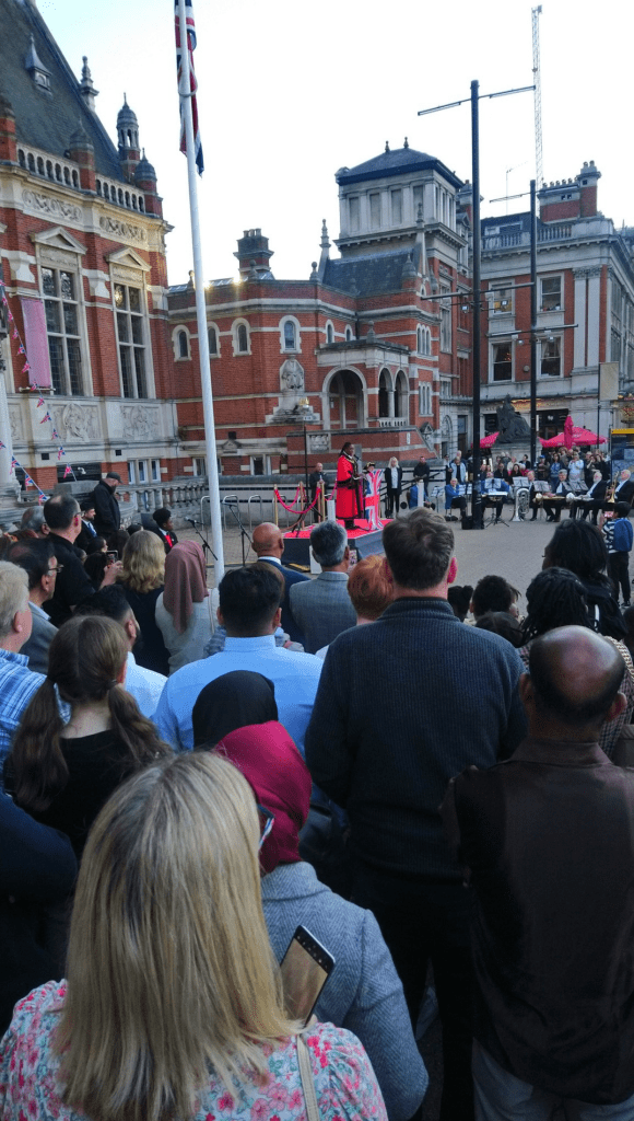It was just starting to get dark in central Croydon when the Mayor lit the beacon watched by the crowd.