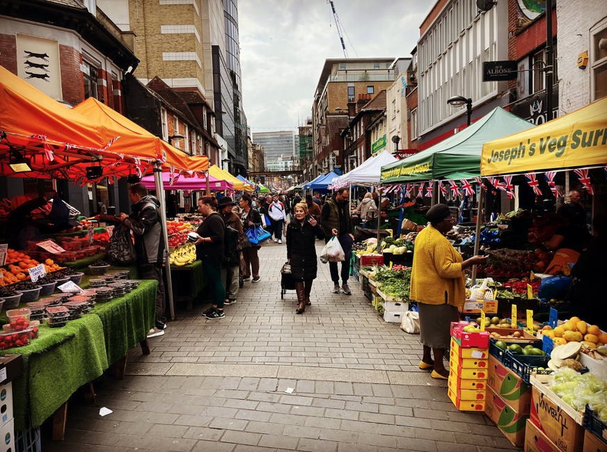 Surrey Street Market was open for business just in case anyone was running low on supplies and as yesterday was Market Day – Surrey Street was looking particularly colourful when bunting was added to the huge array of fruit and vegetables on display.