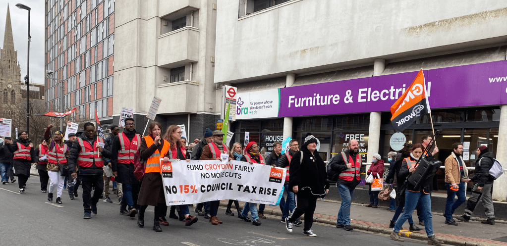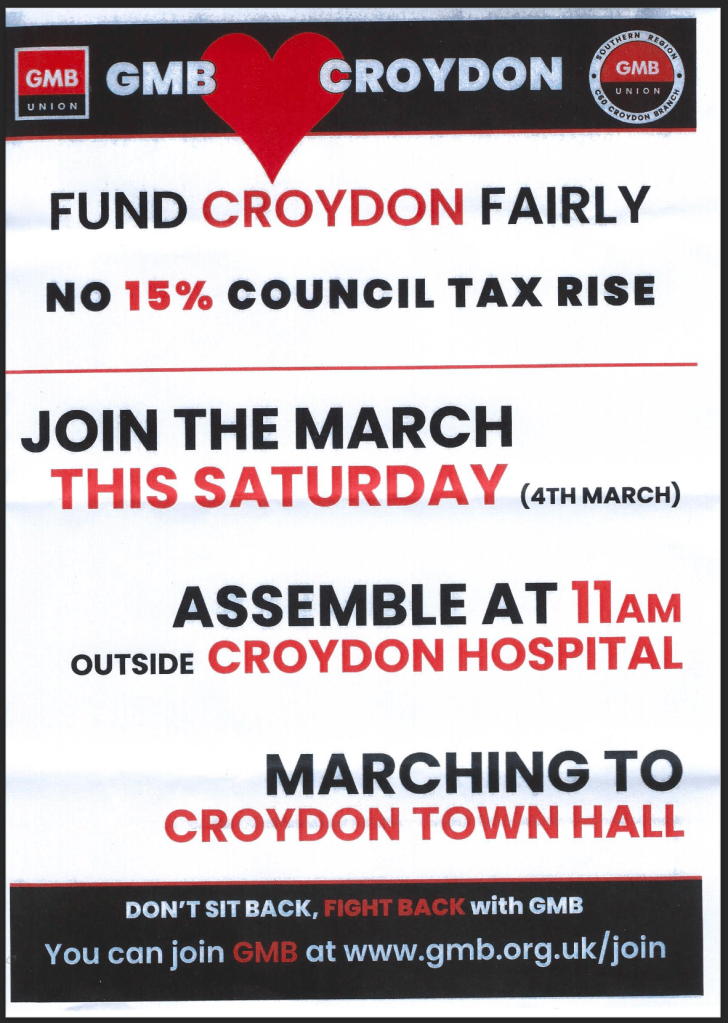 The campaign against the directly elected mayor’s plan to impose a 15% increase on the Croydon council tax is gathering steam as the GMB Union announce their march demanding fair funding for Croydon.